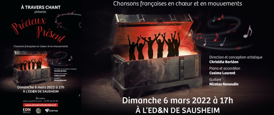 « Le moment présent a un avantage sur tous les autres : il nous appartient ». Animée par cette conviction, la troupe À TRAVERS CHANT dirigée par Christèle Barléon est fière d'entrouvrir l'écrin de son tout nouveau spectacle « PRÉCIEUX PRÉSENT ».